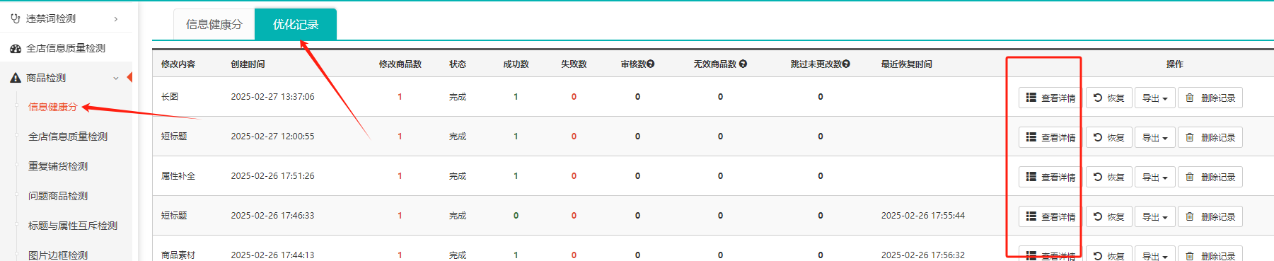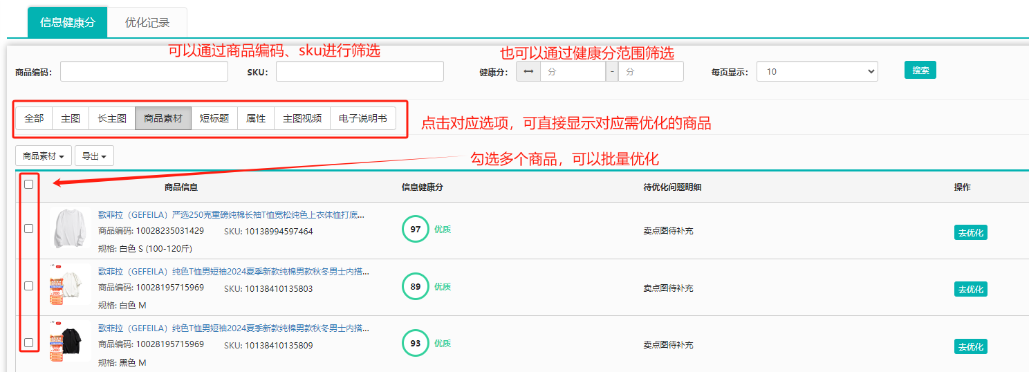 第2步,查看商品健康分,筛选需要优化健康分的商品,可单个优化,或者批量优化