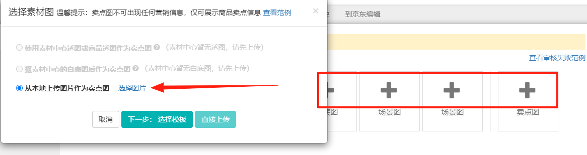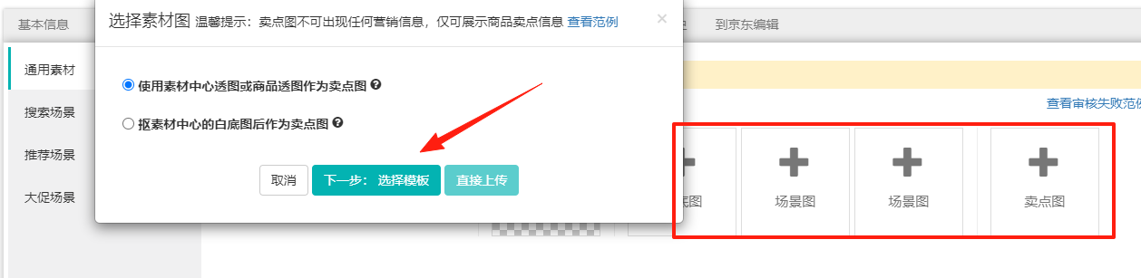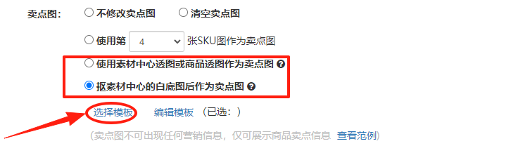 例如:卖点图选择素材中心透图或者商品透图/白底图作为卖点图