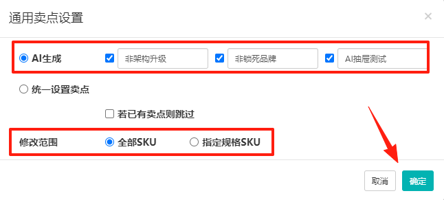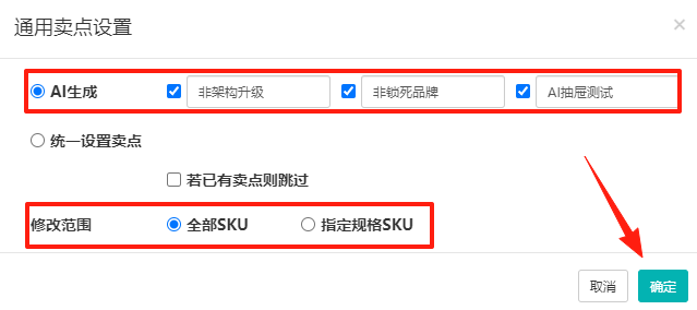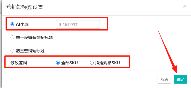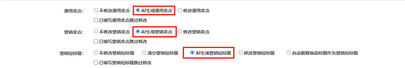 例如:选择AI生成通用/营销卖点、短标题,则AI自动生成(AI生成需点击预览修改后才可显示)