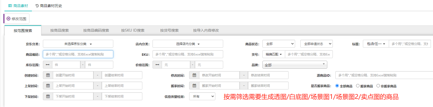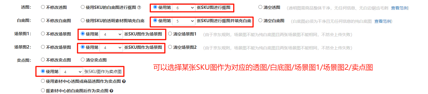 例如:使用某张SKU图作为透图、白底图、场景图1、场景图2、卖点图,默认从商品SKU图里进行选择