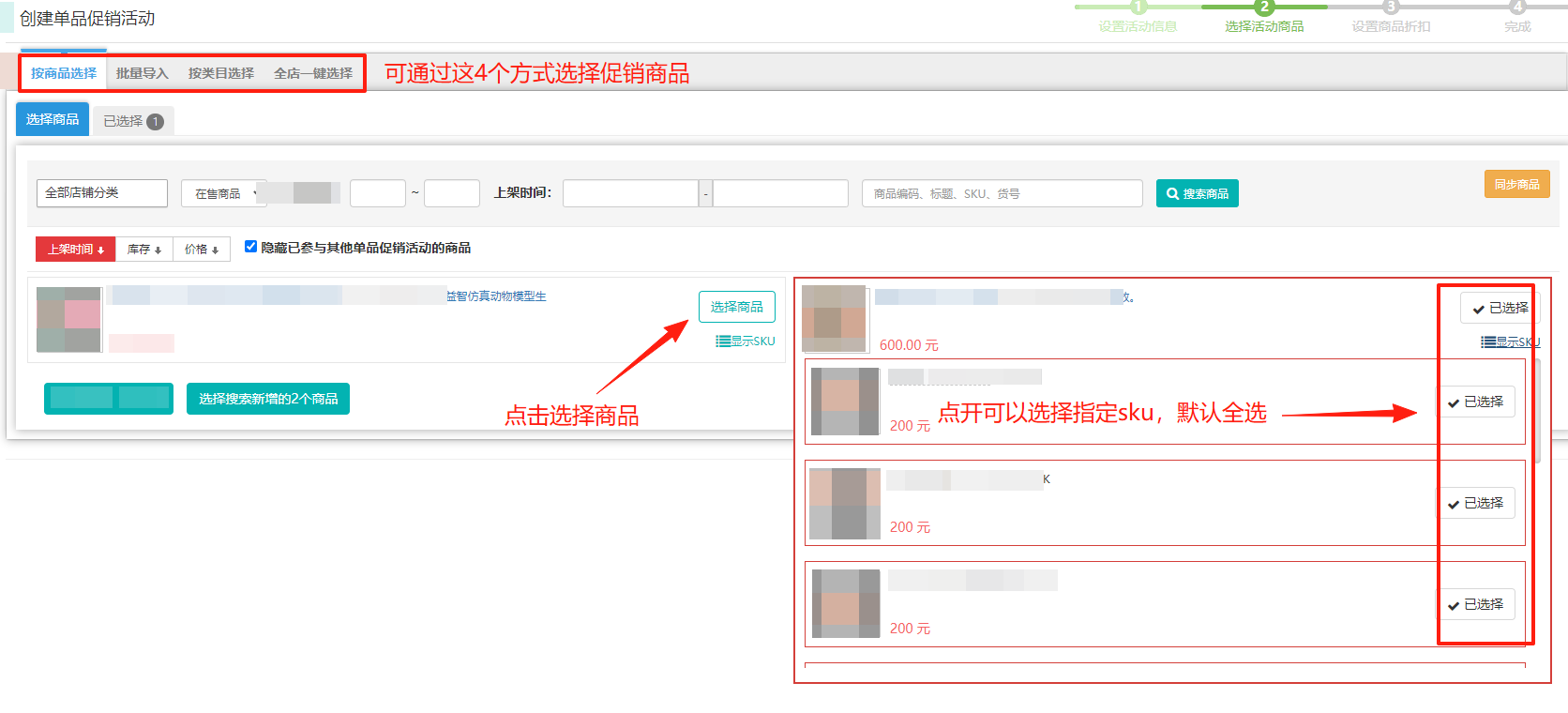 第3步,选择活动商品,支持选择SPU下的指定SKU商品参与活动