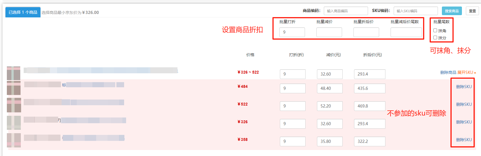 第4步,设置商品折扣,可以批量打折、减价、折后价,根据需求设置