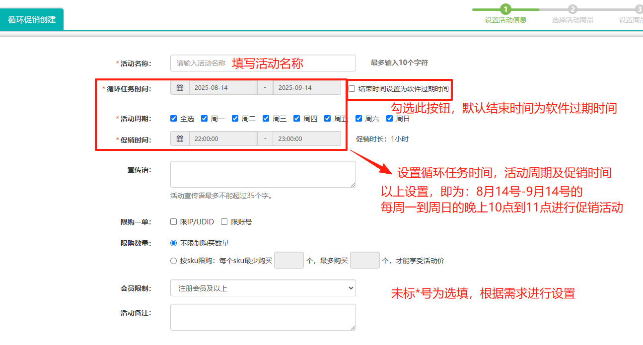 第2步,创建促销活动-填写活动名称、活动时间等等,*号为必填项