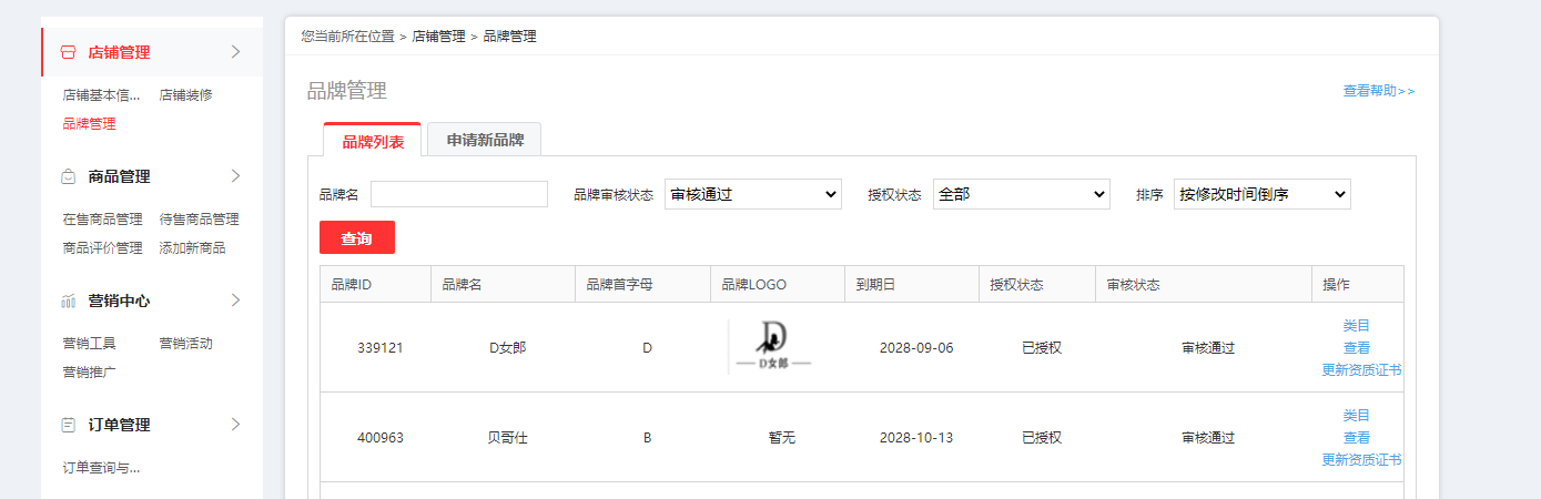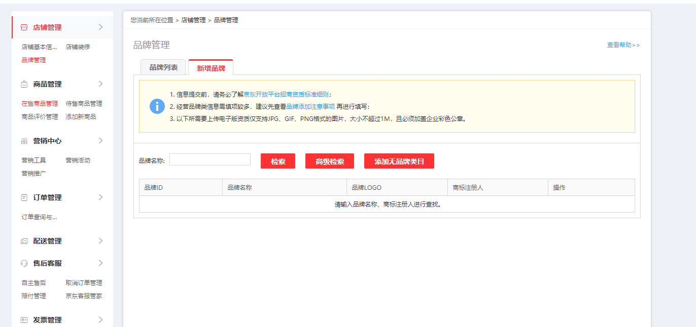 1  店铺管理-品牌管理要申请品牌:新增品牌中添加品牌池内已有的品牌即可。