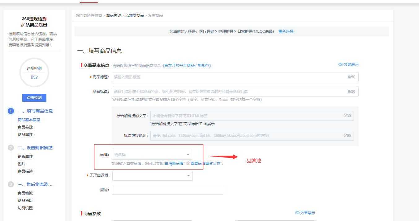 2 查询【商品编辑】-【品牌】属性池里未发现入驻的品牌可进行以下操作: